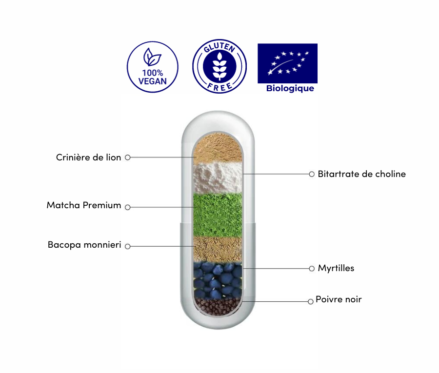 Mehr denn je verwirrt die Welt das Gefühl, mit der Erinnerung an unseren Namen, unsere Liebe oder unser Ereignis nicht Schritt halten zu können. Grâce à la combinaison Bacopa monnieri – extrait de poivre noir, nous veillons à que cela ne se prduise plus¹.